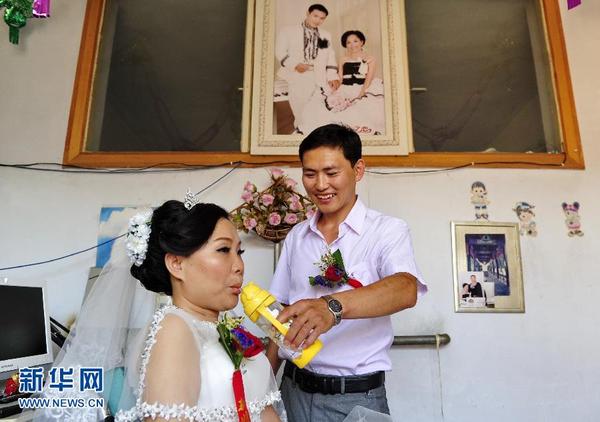 6月28日,新郎常显伟在喂新娘侯春玲喝水。今年37岁的侯春玲是河北省吴桥县人,在2006年的一场车祸中重度瘫痪,之后丈夫与她离了婚,仅头部能动的侯春玲只能依靠开网店维持生计。2012年,黑龙江牡丹江市小伙常显伟,因一次机缘巧合认识了千里之外的侯春玲,侯春玲乐观面对生活的精神,让常显伟格外钦佩,网络的数次交流,这对有缘人擦出了爱情的火花。执着的常显伟告别家乡,不远千里来到吴桥县,成为侯春玲知冷知热的知心人,喂饭、按摩、换尿布……常显伟坚持不懈的付出赢得了侯春玲的芳心,也让爱情开花结果。今年年初,这对年轻人领取了结婚证。为了筹备婚礼,众多得知此事的爱心人士纷纷出谋划策,操心忙碌。从婚庆主持到迎亲车队,从婚纱照片到结婚喜宴,从录像化妆到陪亲队伍,在大家的帮助下,这场公益婚礼如期精彩举行。200多名爱心人士齐聚婚礼现场,见证这对特殊伉俪的幸福时刻。新华社发(牟宇 摄)