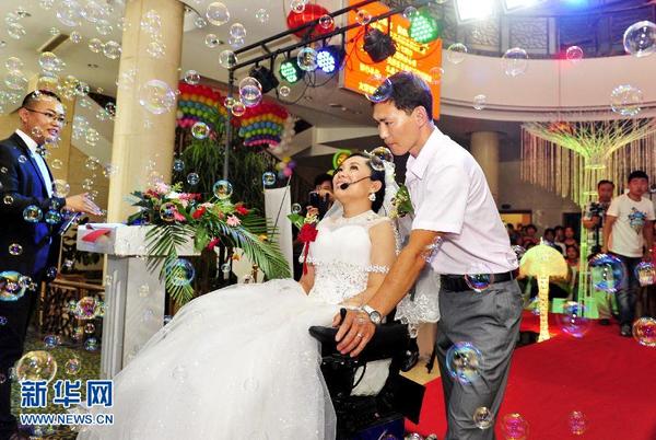 6月28日,在婚礼现场,新郎常显伟推着新娘侯春玲前行。今年37岁的侯春玲是河北省吴桥县人,在2006年的一场车祸中重度瘫痪,之后丈夫与她离了婚,仅头部能动的侯春玲只能依靠开网店维持生计。2012年,黑龙江牡丹江市小伙常显伟,因一次机缘巧合认识了千里之外的侯春玲,侯春玲乐观面对生活的精神,让常显伟格外钦佩,网络的数次交流,这对有缘人擦出了爱情的火花。执着的常显伟告别家乡,不远千里来到吴桥县,成为侯春玲知冷知热的知心人,喂饭、按摩、换尿布……常显伟坚持不懈的付出赢得了侯春玲的芳心,也让爱情开花结果。今年年初,这对年轻人领取了结婚证。为了筹备婚礼,众多得知此事的爱心人士纷纷出谋划策,操心忙碌。从婚庆主持到迎亲车队,从婚纱照片到结婚喜宴,从录像化妆到陪亲队伍,在大家的帮助下,这场公益婚礼如期精彩举行。200多名爱心人士齐聚婚礼现场,见证这对特殊伉俪的幸福时刻。新华社发(牟宇 摄)