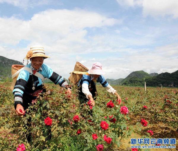 6月29日,云南丘北县八道哨村的两名白族妇女在采摘玫瑰花。云南省丘北县尚金色大地玫瑰花种植专业合作社大力发展高原特色玫瑰花种植和旅游观光产业,以“合作社+农民成员+基地+销售”的运作模式,带动当地1300户农民种植玫瑰花,2014年种植总面积6000亩,平均每亩收入6000多元。新华社记者 杨宗友 摄