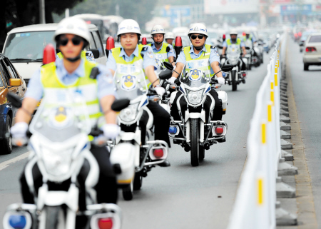 昨日上午,300名新交警奔赴长沙城区主要路口执勤,同时100辆崭新的警用摩托配发一线。 王志伟 摄