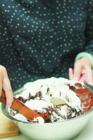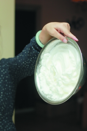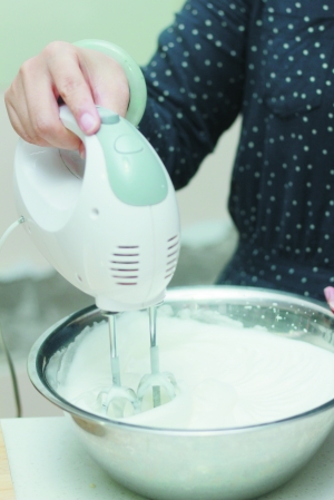 小贴士:不要用金属器材搅拌,打蛋器也不可以,那样会将蛋白的泡弄碎,要用塑料或者木质的东西搅拌。