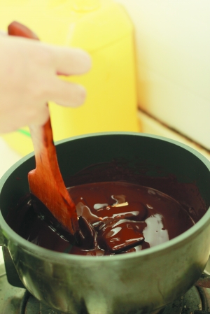 把巧克力掰碎了丢在锅里缓缓搅动,放入50g黄油。