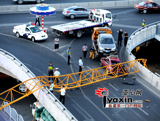 图为7月1日20时40分许,从高空坠落的塔吊吊臂的末端砸落在广汇立交桥西南角的匝道上,导致两辆车被砸中受损,交警部门正在安排拖车将两辆受损车拖走。亚心网记者 张万德 实习生 郝晶 摄