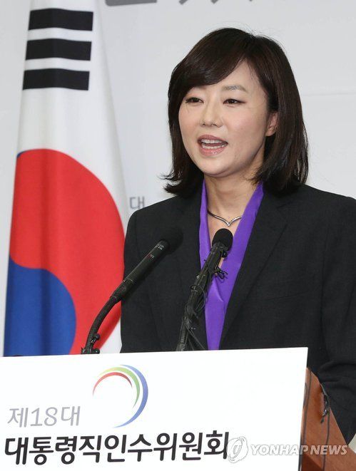 2013年2月17日,候任总统朴槿惠发言人赵允旋被提名为女性家族部长官。图为在交总统职务交接委员会(简称交接委)委员长金容俊在交接委办公大楼发表第三轮人事名单后,赵允旋在现场进行发言。
