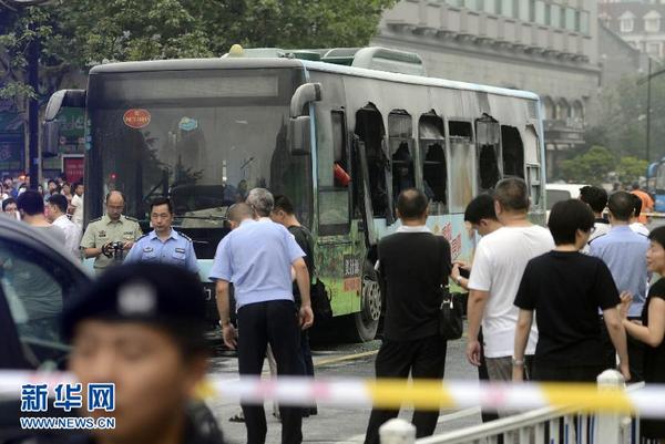 7日5日下午5时03分,杭州市公安局110报警台接群众报警:一辆7路公交车途经东坡路与庆春路交叉口时车内起火燃烧。通报称,经初步核实,送医院就诊的受伤乘客32人,无人员死亡。起火原因正在调查中。图为杭州公交车燃烧事件处理现场杭州公交车燃烧事件处理现场。