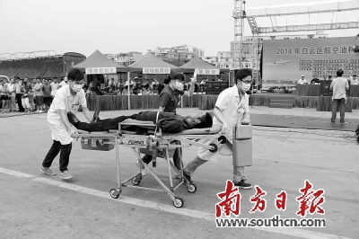 演练现场,区卫生局人员“救治”伤员。南方日报记者 黄伟 摄