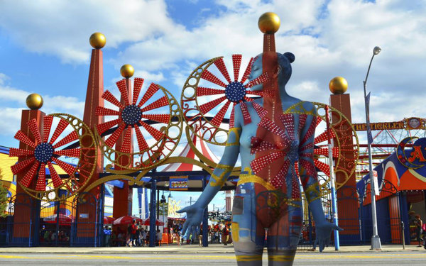 国际在线专稿:据英国《每日邮报》7月7日报道,纽约34岁艺术家特瑞娜·梅里(Trina Merry)日前在许多纽约著名地标建筑前,创造了多幅隐身人体艺术照片。每个场景中,梅里需要花费8个小时在模特身上彩绘,她称这些人体艺术让自己与纽约建立起紧密联系。