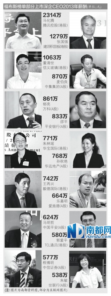在2014中资港股C E O薪酬榜前30名中,总部在深圳的企业的C E O一共只有5人。除了马化腾,还有建滔积层板的张国强(排名14),信义玻璃的董清世(排名20),华宝国际的朱林瑶(排名28),毅德国际的王再兴(排名29)。他们的平均薪酬总额达到1233万元。