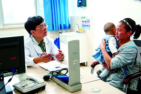 在医院门诊,肖颖彬(左)耐心地劝慰病童家长。新华社 图