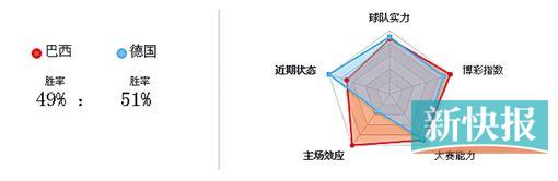 上述五项指标中,德国队与巴西队在“球队实力”、“大赛能力”、“博彩指数”三项中互有高下,拉不开距离,但占有主场之利的巴西在“主场效应”一项上以100∶33完全压制德国;不过,德国则在“近期状态”中以100∶71反制巴西,可以理解为失去马内尔的“黄衫军”近况确实不佳。综合计算后,百度给出了德国51%胜率淘汰巴西的预测。