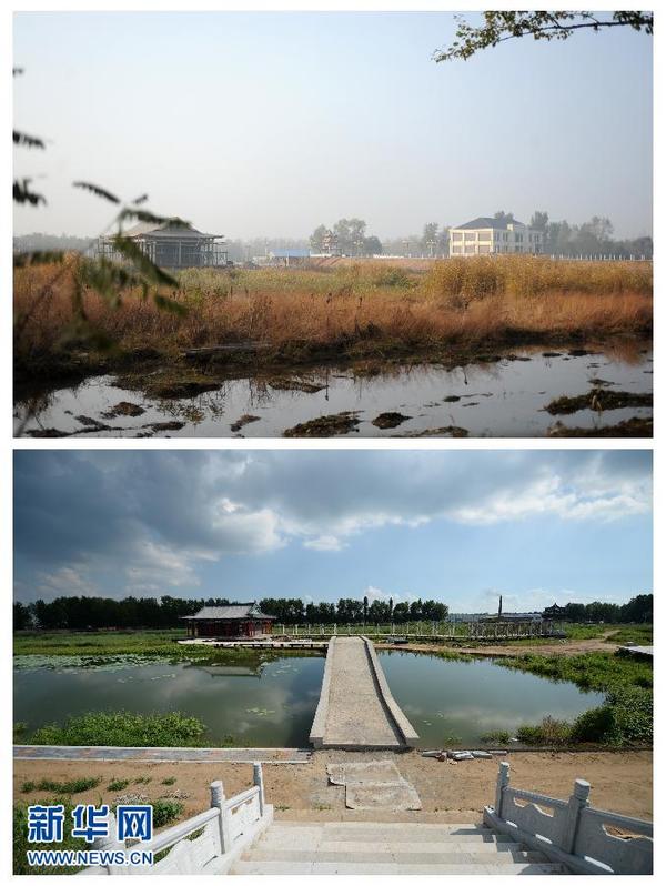 这张拼版照片显示的是记者于2013年10月22日(上图)和2014年7月11日(下图)分别拍摄的“土豪大院”的内景。记者从沈阳经济技术开发区最新了解到,高花街道张福安村村民赵国富被处罚期间顶风修缮“土豪大院”违法建筑问题,7月10日经媒体曝光后,当地党委和政府立即组织有关部门查处。11日决定:罚没违法建筑、追究相关责任人党纪政纪责任、免去张福安村党总支书记兼村委会主任赵国强党内职务。新华社记者潘昱龙摄