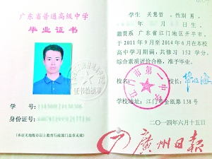 最新的一张毕业证书来自今年刚从江门一中毕业的关慧哲。关慧哲今年参加高考,以理科总分682分的成绩获江门一中第一名,目前已被清华大学录取。关慧哲说,对他而言,高中毕业证书提醒他从这里迈向更高学府,以后取得成绩时要不忘母校栽培。