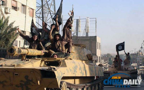 资料图:6月30日在叙利亚Raqqa,伊拉克极端武装组织“伊拉克和黎凡特伊斯兰国”举行游行,展示自控制伊叙边境地区以来缴获的伊拉克军队武器,这些武器包括美国制造的“悍马”多用途军车、重型机关枪和导弹等。