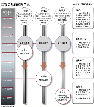 三人中,付晓光降到局级;张田欣降到副处级,且是非领导职务;赵智勇则降为科员。