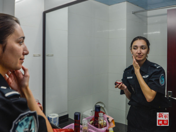 ↑忙碌了一天后,迪丽热巴在寝室里给脸部补水。她说,现在喀什特别热,脸部补水特别重要。而且每次外出执勤时,都要涂上防晒霜(2014年7月16日摄)。