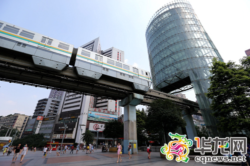 轻轨2号线横穿杨家坪商圈步行街。 首席记者 罗嘉 摄