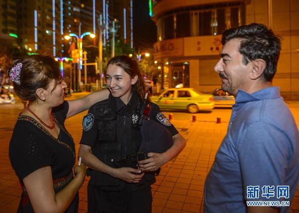 迪丽热巴·牙合甫(中)在休息中巧遇散步到此的父母。简单寒暄后,迪丽热巴·牙合甫离开爸妈继续巡逻(7月15日摄)。近一段时间,来自新疆喀什地区公安局特警支队的女特警迪丽热巴·牙合甫因她的一组照片迅速蹿红网络,网民亲切称她为“萌妹子特警”。记者来到她所在的特警支队,近距离探访迪丽热巴·牙合甫。今年24岁的迪丽热巴·牙合甫是一位塔吉克族特警。2012年从新疆警察学院毕业的她,毅然报考了公安队伍。在经过公务员考试后,迪丽热巴·牙合甫实现了自己的愿望,成为了喀什地区特警支队的一员。迪丽热巴·牙合甫说:“特警工作涉及的任务包括巡逻防控、应急处突等。近期我做得比较多的工作就是在街面巡逻防控,每天早上10点集合领取装备,之后一直巡逻、盘查。”现在,喀什正值高温酷暑季节,迪丽热巴·牙合甫要身背十几公斤重的装备行走在喀什街头,每天近10个小时、20公里的巡逻路,身上的警服一遍遍让汗水浸透又被太阳晒干。“这些苦都不算什么!我们特警支队身处反恐一线,是一支战功显赫的队伍,获得各项荣誉的人特别多。要想在这里受到别人的认可,我只有加倍努力,加倍训练。”迪丽热巴·牙合甫擦干脸上的汗水说。迪丽热巴·牙合甫最感兴趣的是射击训练和体能训练。只要有可能,迪丽热巴·牙合甫就会主动申请加练这些项目。谈到现在自己红遍网络,迪丽热巴·牙合甫显得很平静。“我是特警队里最普通的一员,一片不知名的绿叶。在这个团队里比我优秀、比我辛苦的同事大有人在。我为自己是喀什地区支队一员、能与他们成为战友而感到自豪!” 目前还没有男朋友的迪丽热巴·牙合甫还向记者透露了她的择偶标准:要有责任心,最重要的是理解支持她的工作。 新华社记者 赵戈 摄