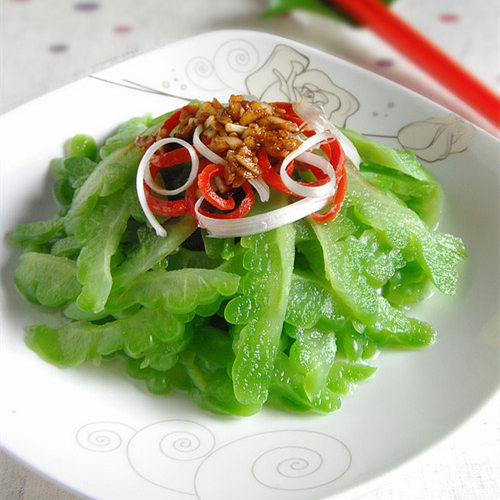 做法:1、苦瓜洗净,对半切开,去掉苦瓜瓤。2、斜刀切成均匀的薄片。3、锅中加水,调入一茶勺的食盐。4、水开以后下入苦瓜绰水。5、捞出放入事先准备好的凉开水里。6、红椒和葱白切丝,泡入水中,以便卷曲。7、把蒜茸放入调料碗中,加入生抽、醋、白糖、香油搅拌均匀。8、把苦瓜捞出稍微控干水分,摆入盘中,再放上红椒和葱白。9、把调料汁淋在苦瓜上。10、锅中烧热少许油。11、把热油浇在蒜茸上即可。