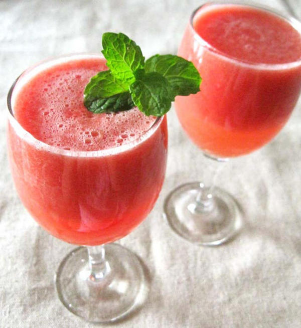 做法:1、西瓜去皮、去籽,番茄沸水冲烫,剥皮去籽。2、二者同时绞汁,两液合并,随量饮用。