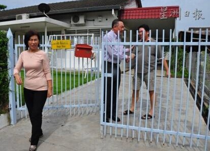 马兴松(中)在离开朱家之际,再次与朱仁隆姐夫握手安慰对方。(马来西亚《星洲日报》)