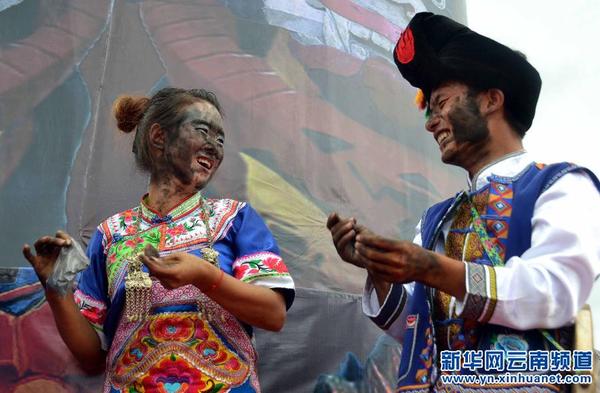 7月18日,一对彝族青年男女在“花脸节”上互抹花脸。当日,2014年中国云南·普者黑花脸节在云南省文山州丘北县开幕,为期一个月的系列民族文化节庆活动同时开启。迄今已有上千年历史的丘北彝族花脸节,既是当地群众祈福平安快乐的象征,也是彝族男女谈情说爱,表达情意的独特方式。 新华社发(范云 摄)
