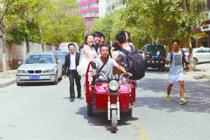 路遇堵车,一对新人乘坐三轮摩托车赶往酒店。本报记者 张学江 摄