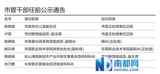 此外,东莞职业技术学院财务处处长(副处级)杨云奇将拟任东莞职业技术学院副院长(正处级);长安新区管委会投资促进科科长肖乃勇则拟任副处长。
