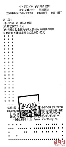 笔者有幸在福州市体彩中心采访了他。据小王介绍,在本届比赛中他多次猜中了比分,都是回报率相当高的比赛。早在小组赛澳大利亚VS荷兰的比赛中,小王就果断地打了2∶3比分,也是50倍投注,中了3200元。在韩国VS阿尔及利亚的比赛中,复选投入100元,中了2400元。进入淘汰赛,更是中了10多张单关比分回报率在5~6倍的单。当然,小王在本届世界杯上最大的回报,还是在7月10日省中心开展的“猜世界杯单场比分,88888带回家”活动中抽中一等奖8888元。