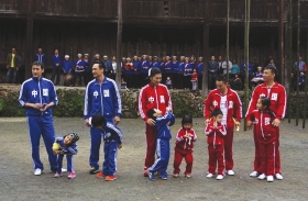 下午,爸爸们在体验古法榨油后,牵着孩子们在细雨中开始了“亲子复古运动会”,5组家庭被分成了红蓝两队,其中陆毅、吴镇宇和我(李锐)是蓝队;黄磊、杨威、曹格是红队,比赛项目为“爬竹竿”“木头人”“传吸管”等游戏,胜者得到了苗族传统的牛角纪念品,另一队则获得安慰奖一大筐新鲜杨梅。