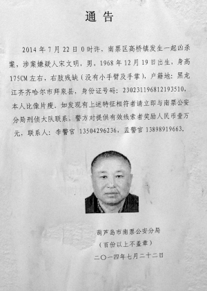 记者看到,村路边张贴着警方发布的通告:7月22日零时许,南票区高桥镇发生一起凶杀案,涉案嫌疑人宋某,男,46岁,身高1.75米,右肢残缺(没有小手臂及手掌),户籍为黑龙江齐齐哈尔人。