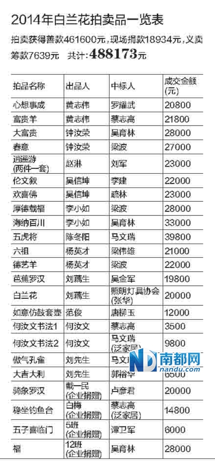 举牌、竞价、一锤定音,上台合影,掌声响起17次。在“白兰花”慈善助学拍卖会上,由艺术家、企业家共同捐赠的23件艺术品昨日全部拍完。这一次,拍卖加上现金捐赠,白兰花基金一共收纳了超48万的“业绩”,很多企业家为此感到高兴,会后拍掌庆贺。