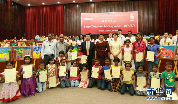 获奖20名选手同斯里兰卡总统第一夫人施兰蒂·拉贾帕克萨和中国驻斯里兰卡大使夫人丁玥同获奖小选手合影。新华社网记者黄海敏摄