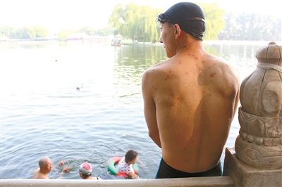 在什刹海一带的前海南沿,以及后海北沿的醇亲王府前,是两处很受游泳者欢迎的野泳区域,每天早上和下午,都有很多市民来这里游上一圈。不过近日,不少来游泳的市民都有些困扰,大家的身上开始长出一些红色的斑点,让人总忍不住想要抓挠。