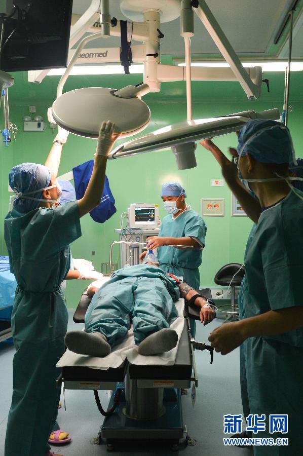 当地时间7月27日傍晚,参加“环太平洋-2014”演习的中国海军和平方舟医院船进行大规模医疗救援演练。10名在舰艇“损管漏水事故”中受伤的“伤员”由直升机从“遇险舰船”送至和平方舟医院船,接受医院船医务人员的“抢救治疗”。新华社记者覃海石摄