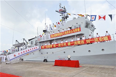 庄严的国歌声在海边奏响,鲜艳的五星红旗缓缓升上桅杆。当天上午,南海舰队某部部队长宣读了“常熟舰”入列命名命令,并为“常熟舰”授旗、颁发命名证书。