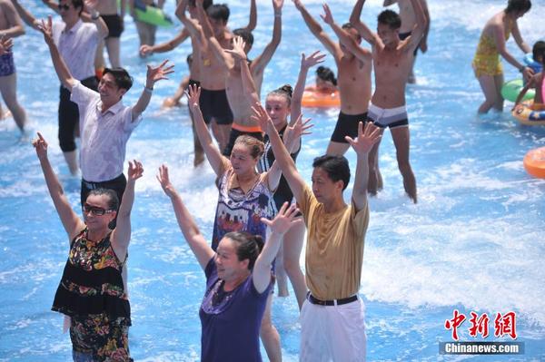 7月30日,重庆洋人街一游泳池内一群大妈大叔们随着“小苹果”音乐在水中跳起了舞。据董大妈介绍:“她们舞蹈团队一共26人,平日都是跳坝坝舞、广场舞娱乐强身健体,在水中跳舞还是第一次”。重庆连日高温,刚刚才结束舞蹈表演的她们被游泳馆老板邀请来水中跳舞,为她们提供一个水上舞蹈的平台,寻找夏日清凉,还吸引了不少游客一同在水中欢跳战高温。陈超摄