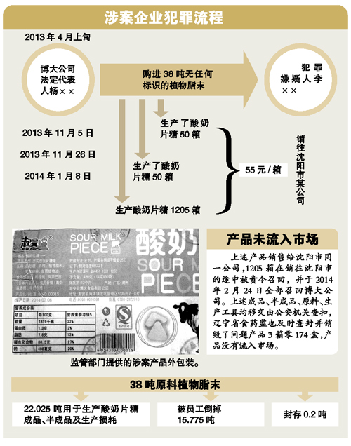 “需要特别说明的是,此次案件涉嫌的产品是酸奶片糖,在获证产品单元中属于糖果制品,不是奶制品。博大公司在获得《食品生产许可证》时取证产品也是糖果制品,这批糖果中所含的三聚氰胺的成分涉嫌因使用三无‘植脂末’原料造成。”郭宇华解释说。