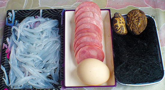 2、发菜洗净,香菇、火腿肉切丝,鸡蛋去蛋黄留蛋清备用。