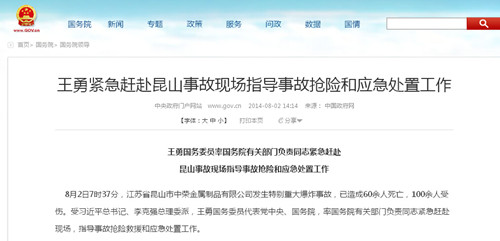 人民网北京8月2日电 据中国政府网消息,8月2日7时37分,江苏省昆山市中荣金属制品有限公司发生特别重大爆炸事故,已造成60余人死亡,100余人受伤。受习近平总书记、李克强总理委派,王勇国务委员代表党中央、国务院,率国务院有关部门负责同志紧急赶赴现场,指导事故抢险救援和应急处置工作。