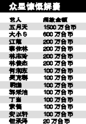 张惠妹(阿妹)透过经纪人陈镇川说:“我们会密切关注灾区和当地灾民,并给予他们最有效的帮助,会全力支持最需要的项目。”罗志祥和萧亚轩所属的经纪公司表示:“公司会把所有员工的一日所得捐出去,艺人们也已私下捐款,但不便公开金额。”