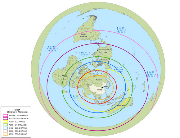 从此图可以看出,彩色圆圈代表打击范围,以中国为圆心,由内至外分别为:
