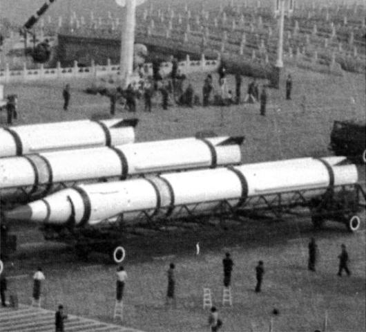 东风-3(北约代号CSS-2)型导弹:射程2650公里,可搭载一枚100万吨~300万吨当量的核弹头,1970年服役。1987年,东风-3曾出口沙特,沙特曾对其进行改装,成为中东地区不可忽视的一直力量。近些年来,我国的东风-3逐渐被东风-21替换,但仍未完全退出现役,在2010年解放军对部分东风-3进行了延寿,2009年还曾高调进行过试射。