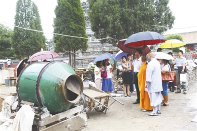 文物局执法人员查看寺内的违章建筑施工情况。