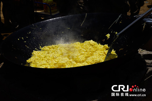 8月5日12时,云南鲁甸6.5级地震震中龙头山镇骡马口村,成都军区某部官兵正在为受灾民众分发午饭,这是地震发生以来,灾区民众吃上的第一口热乎饭。午饭包括炒鸡蛋、炒青菜、米饭等。由于通往龙头山震区的唯一道路时常出现塌方断路,目前仍有大量赈灾物资在送往震区的路上。图为官兵为灾区民众烹饪炒鸡蛋。摄影:沈湜