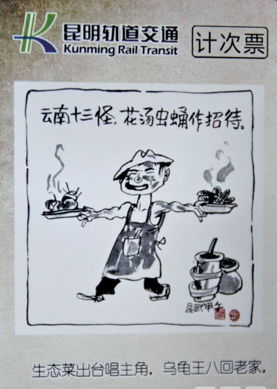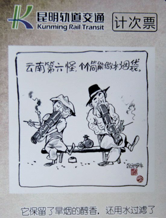 记者看到,不同于单程票的易折和轻薄,计次票稍显“厚实”。据介绍,“云南十八怪”为票面的计次票是与云南著名漫画家李昆武先生合作推出的,票面上用短短几十字生动形象地勾勒出了云南各地的风土人情和地域特色。通过“云南十八怪”主题计次票,希望能让没有机会接触云南文化的人了解到云南的奇妙乐趣。