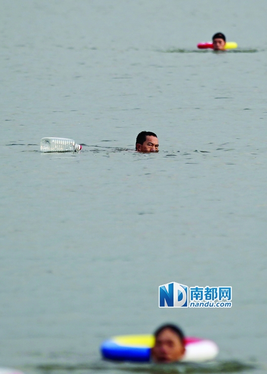 昨日清晨,白云湖西湖中,一名偷泳者用的救生装备是一个空瓶子。 南都记者 马强 实习生 张梓望 摄
