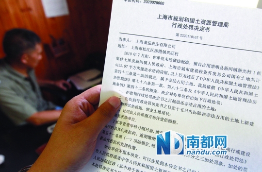 记者了解到,2010年9月,上海市规划和国土资源管理局在一次航拍中发现了这一违规用地的情况,调查确认后于2011年9月对蕃茄农庄进行了处罚,除要求退还非法占用土地外,还需在15日内拆除在非法占用的土地上新建的建筑物,恢复土地原貌并罚款8.31万元。