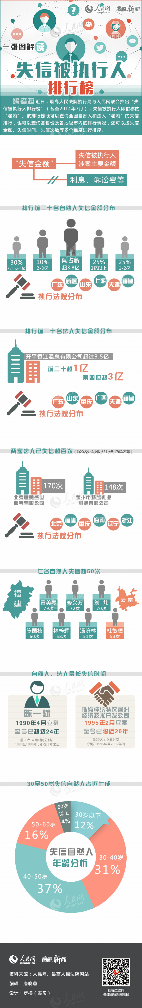 编者按:近日,最高人民法院执行局与人民网联合推出“失信被执行人排行榜”(截至2014年7月),失信被执行人即俗称的“老赖”。该排行榜既可以查询全国自然人和法人“老赖”的失信排行,也可以查询各省份及各地级市内的排行情况,还可以按失信金额、失信时间、失信次数等多个维度进行排序。