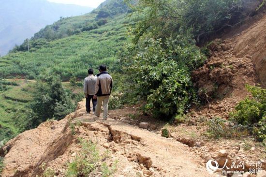 通往小冲子社的道路全部中断,进去只能靠步行。图为8月7日人民日报——人民网记者跟随村民徒步前往小冲子村。(人民网 虎遵会 摄 )