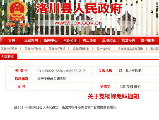 昨日下午,洛川县城市管理局各办公室工作正常,有的工作人员正准备上街清理野广告,大家对党某的事情并不知道太多,只说党某被免职了,原因不明。在洛川县政府网站,人事任免一栏中,关于党某的免职只有简单的一句话:经2014年8月6日会议研究决定,免去党某洛川县城市管理局局长职务。而仅隔一行,就是党某的任职通知。